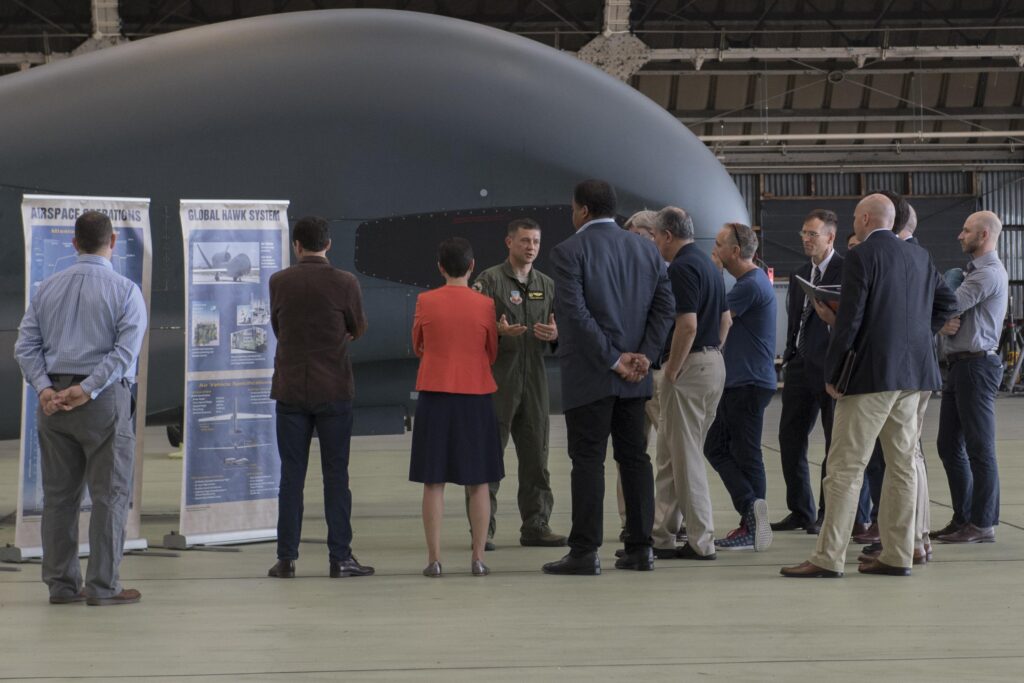 Members of the Defense Innovation Advisory Board inspect a Global Hawk drone at Yokota Air Base in Japan.