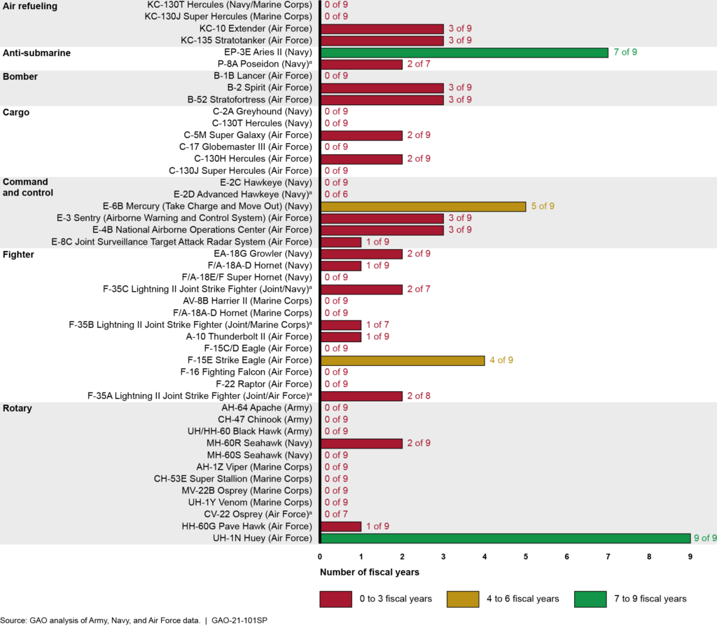 - Some 24 aircraft – more than half – never met their readiness goals in the nine years from 2011 through 2019.