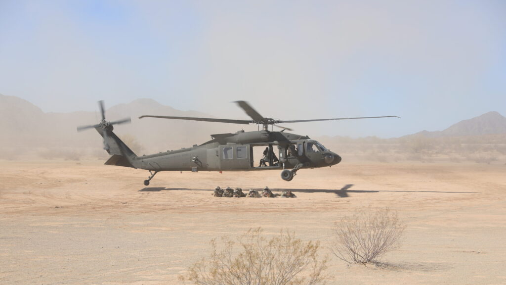 Crew members with 2nd Battalion, 82nd Aviation Regiment Assault Helicopter Battalion, 82nd Airborne Division, take part in an air assault exercise during PC21. (US Army/Destiny Jones)