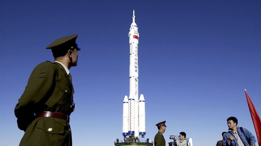 Military soldiers stand guard as the Shenzhou VI spacecraft, sitting atop of the LM-2F carrier rocket, is moved towards the launching pad in Jiuquan Satellite Launch Center on October 7, 2005 in Jiuquan of Gansu Province, northwest China. (Photo by China Photos/Getty Images)