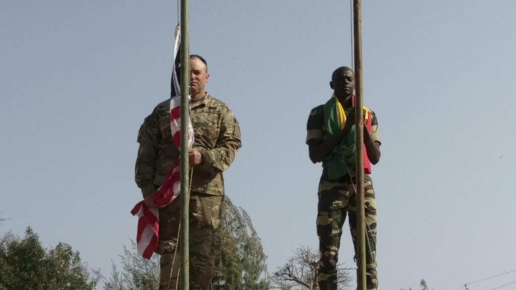 Sgt. Jack Curtis prepares to raise the American Flag during a ceremony honoring the partnership between the Vermont National Guard and Senegal, April 24, 2018, Centre D’Entrainment Tactique N7, Senegal. (U.S. Army National Guard Photograph by Sgt. Jeremy Nadeau)
