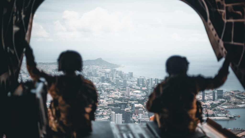 A CH-47 Chinook helicopter crew, assigned to the 25th Combat Aviation Brigade, monitors flight operations over-looking the city of Honolulu while in support of exercise Joint Pacfic Multi-Readiness Center 22-01 in Honolulu, Hawaii, Oct. 17, 2021.(Staff Sgt. Timothy Hamlin/US Army)