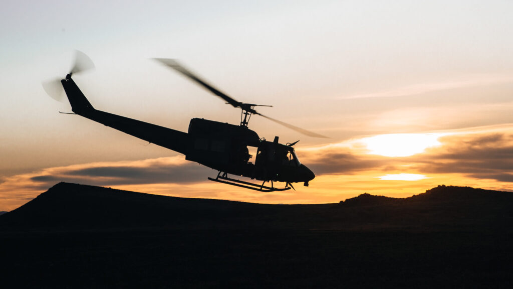 A U.S. Air Force Bell UH-1N Twin Huey lifts off from an observation point at Gowen Field Air National Guard Base, Idaho, May 4, 2022. (Cpl. Patrick King/US Marine Corps)