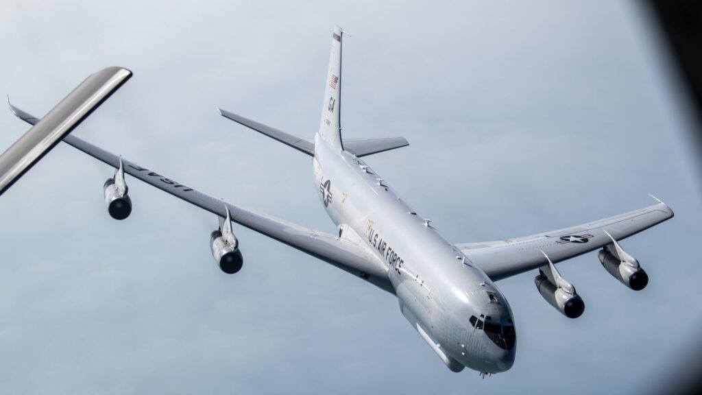 A U.S. Air Force E-8C Joint Surveillance Target Attack Radar System pulls away from a U.S. Air Force KC-135 Stratotanker after completing aerial refueling over the U.S. Central Command area of responsibility Oct. 5, 2020. The E-8C Joint STARS is an airborne battle management, command and control, intelligence, surveillance and reconnaissance platform. (U.S. Air Force photo by Senior Airman Duncan C. Bevan)