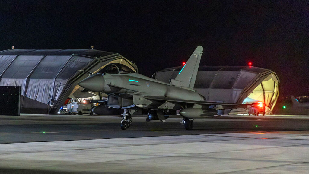 A UK Royal Air Force Eurofighter Typhoon fighter jet returns to base at RAF Akrotiri, Cyprus, after striking military targets in Yemen (UK MoD)