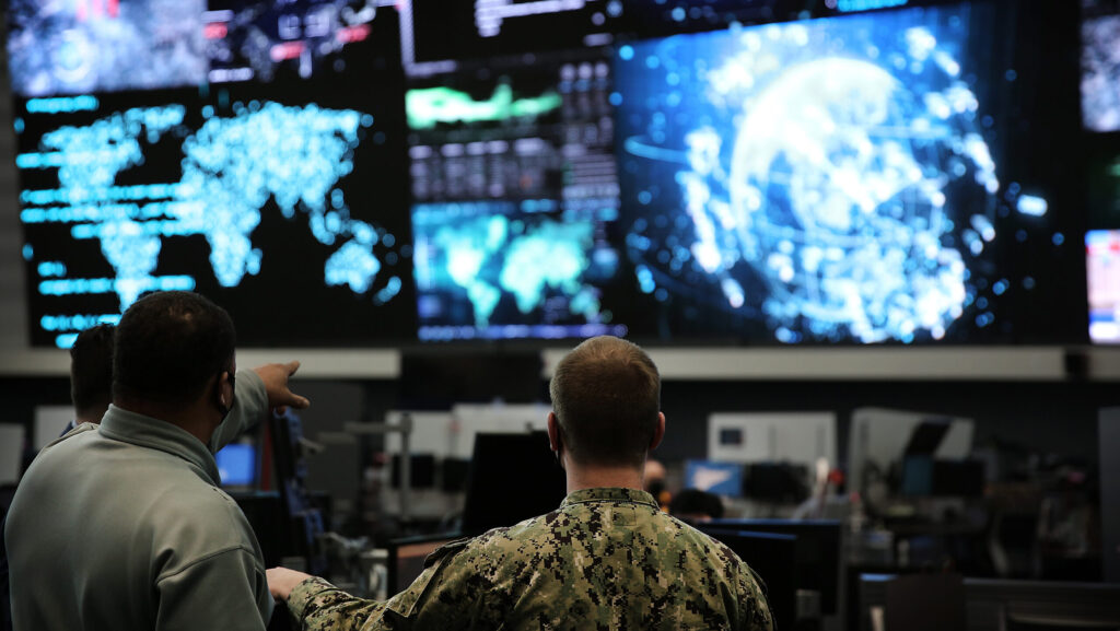 US Cyber Command members work in the Integrated Cyber Center, Joint Operations Center at Fort George G. Meade, Md., April. 2, 2021. (Photo by Josef Cole)