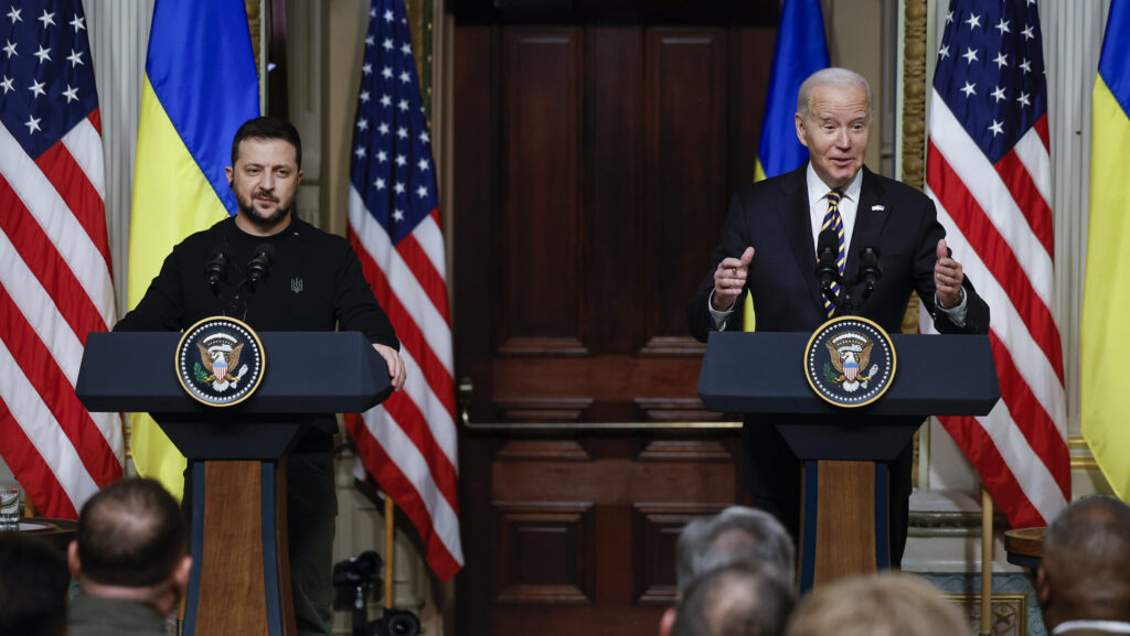 Ukrainian President Volodymyr Zelensky (L) and U.S. President Joe Biden hold a news conference in the Indian Treaty Room of the Eisenhower Executive Office Building on December 12, 2023 in Washington, DC. (Photo by Chip Somodevilla/Getty Images)