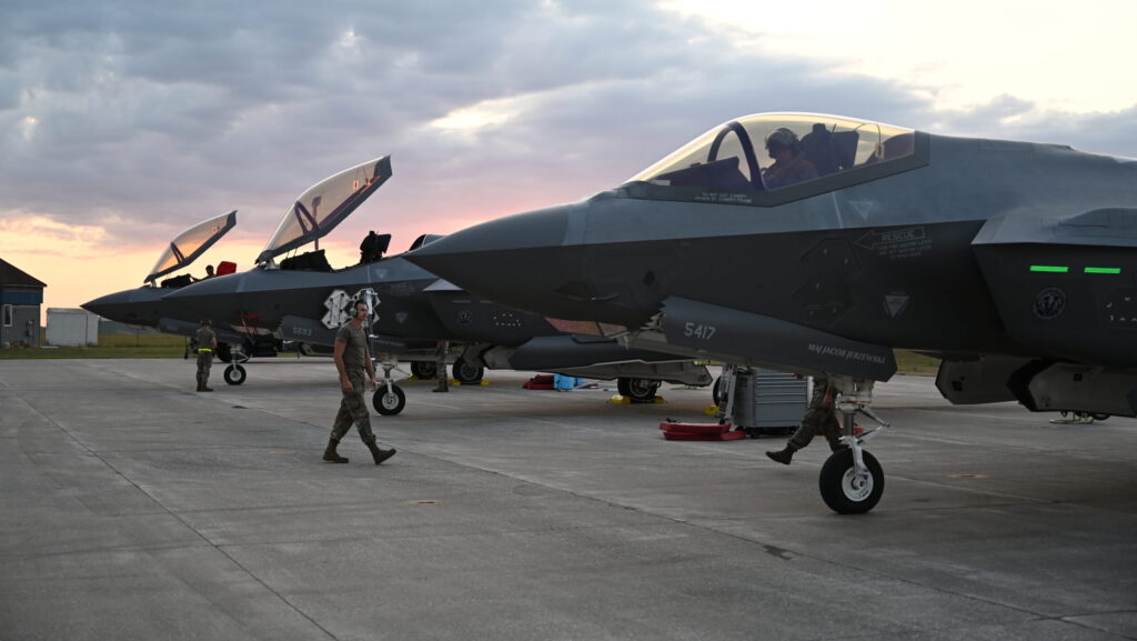 Airmen assigned to the Wisconsin Air National Guard’s 115th Fighter Wing complete post-flight inspections on U.S. Air Force F-35A Lightning II aircraft Aug. 13, 2024, during Northern Lightning, an exercise providing realistic combat training for and emphasizing joint asset integration, held annually at Volk Field Air National Guard Base, Wisconsin. (U.S. Air National Guard photo by Airman 1st Class Josh Kaeser)