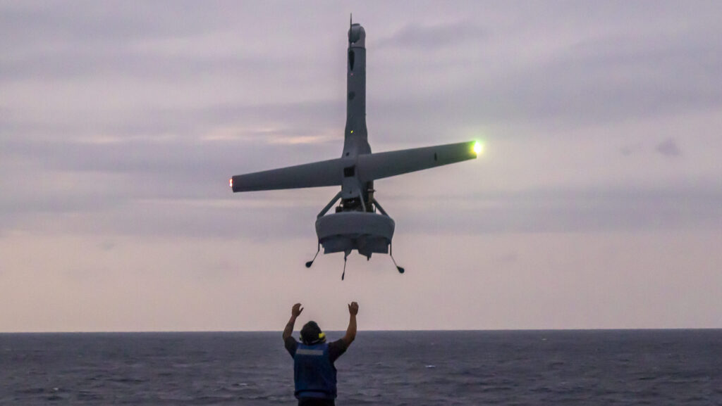 A civilian contractor embarked with the 31st Marine Expeditionary Unit, lands a V-BAT drone aboard the USS Green Bay in the Philippine Sea, Feb. 2, 2023. (U.S. Marine Corps Sgt. Andrew King)
