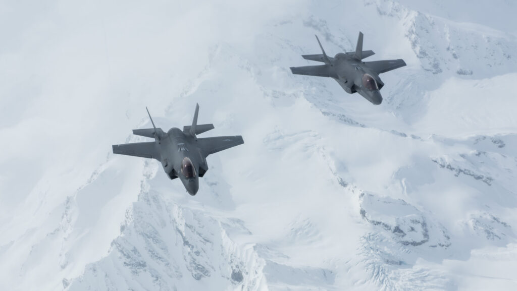 Two F-35A Lightning II aircraft fly over the Alaska Range en route to their new home at the 354th Fighter Wing, Eielson Air Force Base, Alaska, April 21, 2020. (U.S. Air National Guard photo by Tech. Sgt. Adam Keele)