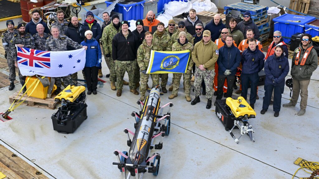 U.S. Navy, Royal Navy and Royal Australian Navy personnel pose for a picture with Mission Specialist Defender Mark IV remotely-operated vehicles (ROV) and an IVER4 900 autonomous-underwater vehicle aboard the Norwegian-flagged seabed construction vessel MV Island Pride during the Australia, United Kingdom and U.S. (AUKUS) Pillar II Subsea and Seabed Warfare Event Two/Integrated Battle Problem 25.1. (US Navy/Justin E. Yarborough)