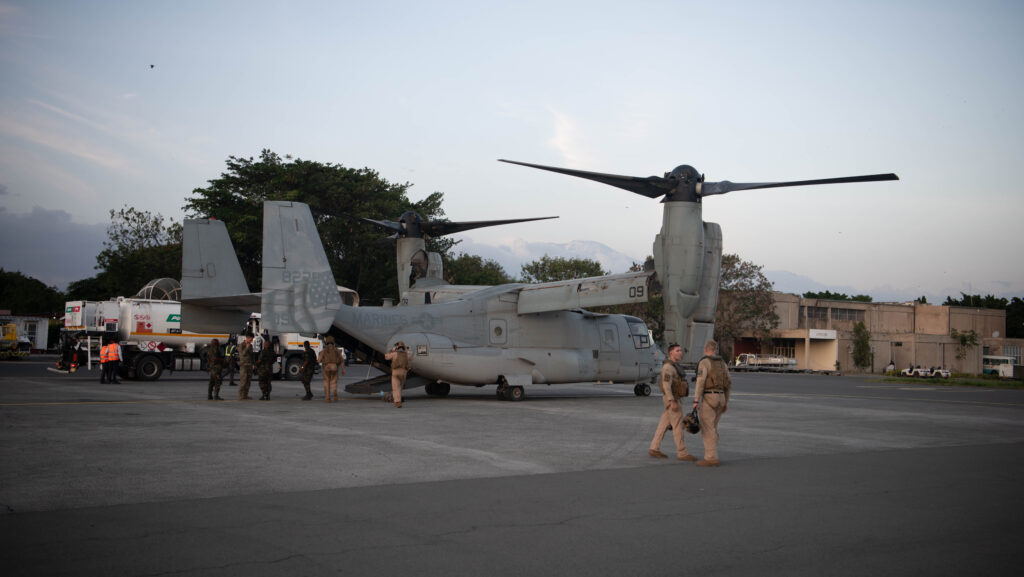 U.S. Marines refuel an MV-22 Osprey at the Kilimanjaro International Airport in Tanzania, as part of a troop transport flight during Exercise Cutlass Express 2025 Feb. 12, 2025. (U.S. Navy video by Mass Communication Specialist Seaman Chance Hanson)